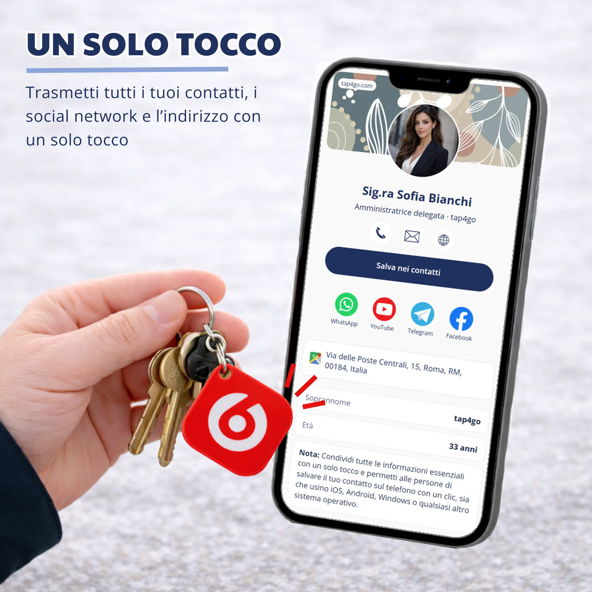 T4G di Tap4Go in stile intreccio ti permette di condividere contatti, social e link con un solo tocco, aprendo una pagina personale digitale chiara e sempre aggiornata. Il vero vantaggio è il servizio: puoi modificare testi, sfondo, recapiti e contenuti in qualsiasi momento, e salvare il contatto direttamente nella rubrica del telefono.